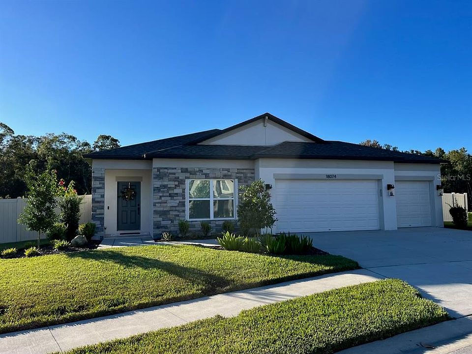 Welcome to Talavera! Come check out this beautiful home built by M/I Homes with 3 bedrooms, 2 bathrooms, and a 3 CAR GARAGE on a 1/3 ACRE PREMIUM LOT! The front room could be transitioned into an office or 4th bedroom. You will love the upgrades this home has, including upgraded builder kitchen package, custom-built floating shelves, WOOD PLANK TILE throughout, VINYL FENCE, decorative stone, BACKSPLASH, cabinet pulls, upgraded light fixtures throughout, window treatments including custom made ROMAN SHADES in kitchen and family room, interior door hardware, additional recessed lighting in family room, and more! This home comes equipped with hurricane shutters so you can rest easy when the winds pick up and it's time to protect your home. Enjoy watching the sun slowly sinking behind the trees from the back porch as the pets or little ones roam around your large back yard. You'll also see plenty of deer, turkeys and native birds. There is plenty of room for entertaining guests in this open-concept home and the cul-de-sac location makes for a nice, peaceful setting. Your 3 car garage is perfect for extra storage or your golf cart. The community pool, playground, park and basketball court are a great fit for the active owner. This home is a must see to appreciate the relaxing lifestyle it will provide to the next owners!