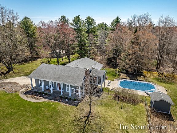 Welcome to your dream home surrounded by nearly 12 acres of gorgeous privacy, while being just a short distance from PJ Hoffmaster State Park. This spacious 4 bed, 3 bath home spans over 3,600 sq ft and is the ultimate private oasis. This awe-inspiring property also includes an inground pool, 30x40 pole barn, and a serene, deep spring fed pond. Inside, the living room features cathedral ceilings, wood burning fireplace with elegant Georgian marble surround, and sliders that lead to a screened-in porch with tranquil views. Off of the great room, sliders lead to the composite deck with mechanical awning, and has a spiral staircase leading down to the pool. The kitchen features maple cabinetry, stainless steel appliances, and snack bar. The office is situated just off the great room and features built-ins and large bay window. Completing the upper level is the primary bedroom with ensuite featuring tiled shower, and 2 additional bedrooms and full bath. The walkout lower level grants you pool access with sliders to the patio, as well as large family room, 4th bedroom, and full bath. Additional perks include another outbuilding that could be a great mancave or workshop. Attached 2 stall garage is heated. Come see the beauty of this private paradise!