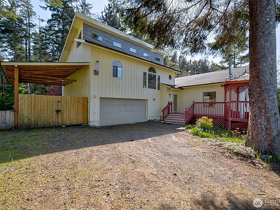 One of a kind Tides West 3 bedroom. Recently refreshed and move in ready. Open kitchen and living room floor plan. Wood burning fireplace to keep you cozy. Adorable kitchen with view of private back yard and patio. 2 bedrooms and full bath off the living room. Head on upstairs to a spacious great room and private primary suite with attached bathroom and walk in closet. Propane fireplace in primary bedroom. Head on down to the oversize laundry and utility room with patio and garage access. 2 car garage with lots of storage. Step outside and enjoy the fenced patio and grass area. Beyond the fence- there is raised bed gardens, a tool shed and stunning territorial views. Tides West community has private lake and beach access. Welcome Home!