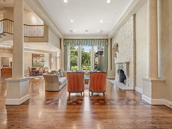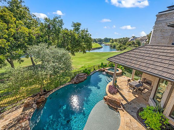 Exceptional Bob Thompson estate in the gated community of Cliffs of Gleneagles, perfectly positioned with panoramic views of Gleneagles Country Club, White Rock Creek, and the surrounding greenbelt. Designed with a distinctive horseshoe layout, this residence maximizes natural light and showcases its stunning scenery from nearly every room. Elegant architectural details set the tone throughout: herringbone hardwood flooring, dramatic stone accent walls, and wood ceiling beams create warmth and sophistication. Expansive formal living and dining rooms feature soaring ceilings and floor-to-ceiling windows that frame golf course vistas. The inviting great room blends seamlessly with the breakfast area and chef’s kitchen, where three prep sinks, dual dishwashers, professional-grade appliances, and a warming drawer cater to both grand entertaining and everyday comfort. The luxurious primary suite offers a fireplace, French doors opening to the patio, and a spa-inspired bath with walk-in shower, soaking tub with switchable privacy windows, and an oversized custom closet. A private study with its own staircase is tucked above the suite, while the upstairs game room and terrace capture sweeping golf course views. Outdoor living is truly resort-style, designed for both relaxation and entertaining. The renovated pool and spa offer smart-app controls for heating, lighting, and waterfall features, while the covered patio with a stone fireplace sets the stage for cozy evenings with friends and family. Enjoy morning coffee overlooking the golf course, practice your short game on the backyard putting green, and take in the lush landscaping that frames uninterrupted views of the fairways and greenbelt. Additional highlights include a 3-car garage, whole-home surround sound, smart sprinkler systems, energy-efficient windows, and a high-end roof. Just minutes from the Dallas North Tollway and George Bush Turnpike, this home offers the perfect blend of privacy, luxury, and convenience.