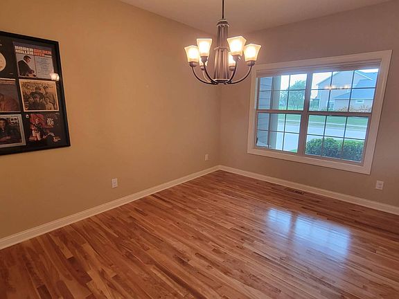 Backing right up to the golf course, this stunning 4-bed, 3-bath walkout ranch offers prime living. Enjoy the view from your Trek deck and patio, or practice your short game on the private putting green! A huge front porch welcomes you inside to a home featuring beautiful hardwood floors and an open layout. The main level includes a formal dining room and a great room with a gas fireplace. The eat-in kitchen is a chef's dream with a center island, granite counters, tile backsplash, and stainless steel appliances (DW & Fridge new 2020). The master suite is a true retreat with a walk-in closet, jetted tub, separate shower, and dual vanity. A convenient 1st-floor laundry/mud room completes the main level. The walkout lower level is perfect for entertaining, boasting a large family room with surround sound, a full wet bar, the 4th bedroom, a full bath, and storage. Additional features include a Geothermal HVAC system, irrigation system, LeafGuard gutters, a Radon system, and nearby bike paths. This home is truly in top condition and ready for you!