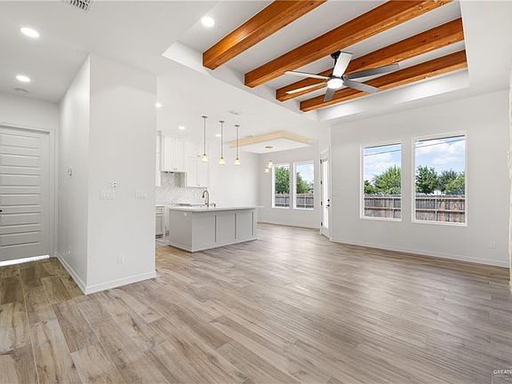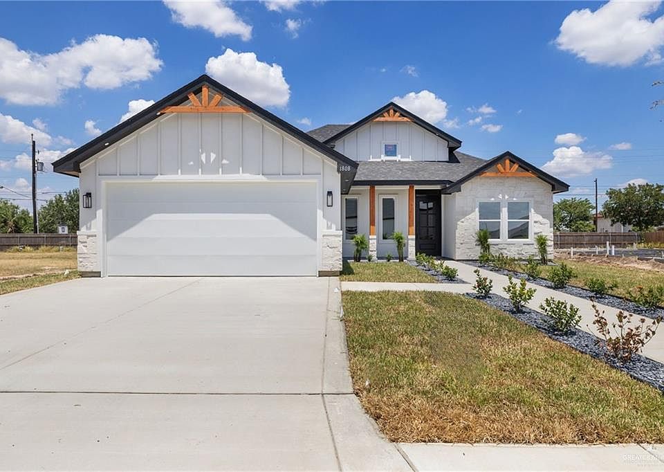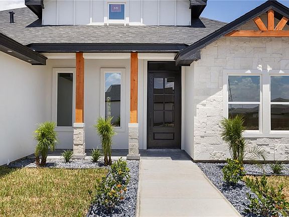 Nestled in the desirable Laguna Oaks subdivision in Mission, TX, this newly constructed home offers 3 bedrooms, 3 full bathrooms, plus an office within 1777 living square feet. The open concept floor plan features a stone veneer accent wall with an electric fireplace, creating a warm and inviting living space. The kitchen overlooks the living room and includes ample custom cabinetry, a quartz island with a dishwasher connection, and a walk in pantry. High ceilings with cedar beams extend into the outdoor space, complementing the home's thoughtful design. Builder upgrades include porcelain tile floors, 8 foot doors throughout, and spray foam insulation in the ceilings for energy efficiency. The private master suite is located on the opposite side of the home and features a double vanity, private commode, large walk in shower, and spacious walk in closet. Additionally, one of the back bedrooms offers its own full bathroom with a walk in shower and direct access to the back patio.