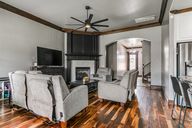 Open-concept layoutMaster suiteElegant double crown moldingJetted tubCustom oversized closetDesigner hardwood floorsExtended patio