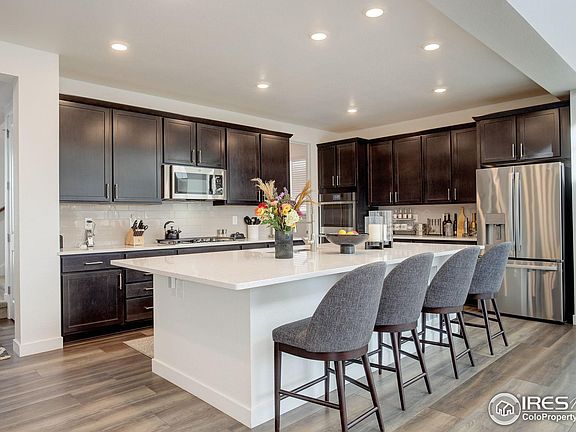 Welcome to this like-new Aspen floorplan by Lennar, a beautifully designed 5-bedroom, 4-bathroom home in the charming community of Morgan Hill. This home offers a blend of modern style and comfort. Step into the open-concept living space where floor-to-ceiling tinted windows bathe the room in natural light while offering privacy and energy efficiency. The main level features a convenient bedroom and full bathroom, ideal for guests or multi-generational living. Upstairs, the spacious primary bedroom features a luxurious ensuite bathroom and a large walk-in custom closet system, providing ample storage and organization. Another 3 secondary bedrooms and spacious loft are upstairs, along with two additional secondary bathrooms. Storage is abundant throughout with walk in closets, a full unfinished basement and a total of 3-car attached garage spaces. Garage has been pre-wired for EV charging. Outside, enjoy a fully professionally landscaped backyard complete with a stamped patio, perfect for outdoor entertaining or quiet relaxation. The home is beautifully lit with permanent Jellyfish lighting, adding a warm and inviting glow to the exterior. Morgan Hill offers a community pool, two parks, breathtaking views, a trail system that connects to Downtown Erie and is the site of a future Town of Erie park.
