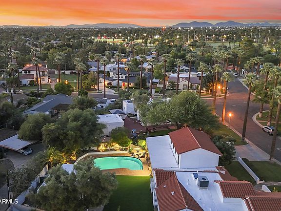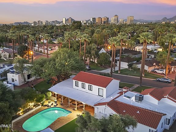 A rare gem in historic Encanto-Palmcroft. This 1940 Spanish Revival estate offers 3,358 sq ft of living space, including 4 beds, 4 baths in the main home and a 637 sq ft detached casita with kitchen, shower, full-size washer/dryer, sleeping nook, and private entrance. New winter grass installing this week! Rich in character with exposed brick, original Saltillo tile, vaulted beamed ceilings, adobe-style fireplace, and herringbone hardwood upstairs. The kitchen features Carrera marble counters and a butler's pantry with second washer/dryer and fridge. Resort-style backyard with heated diving pool, new pump, heater, vacuum, and misting system. Also includes Bianco Greco marble, EV charger, new roof in 2022, new gutters, fresh exterior paint, permanent safe, and fenced area behind casita. and a fenced area behind the casita for pets, storage, or added privacy. Historic elegance meets everyday comfort. Kitchen counters are Carrera Marble to complete an elegant finish. There is a Nanit monitoring system that coveys with cameras and has a dedicated line to ensure no interruptions with connectivity. Fresh winter grass to be put in within 2 weeks. New sewer line installed from the rear of the home to N 13th Avenue.