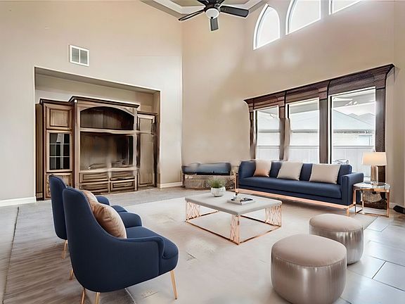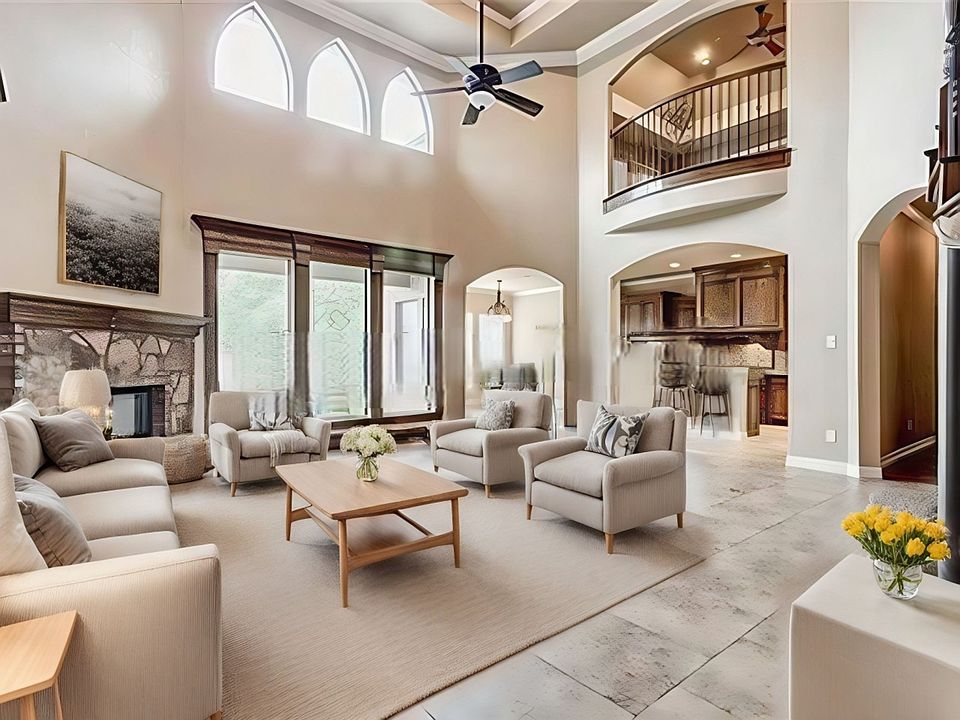 - Entrance: Dramatic 2-story entry with double iron doors and soaring ceilings