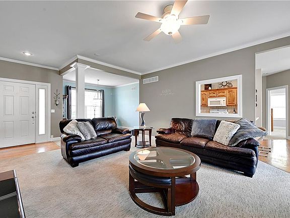 This charming home is filled with natural light, thanks to its abundance of windows throughout. The spacious great room features a cozy gas fireplace, beautifully framed by windows on either side, and seamlessly flows into the kitchen—perfect for both everyday living and entertaining. The kitchen offers warm hardwood floors, generous cabinetry, and a sunny breakfast nook. Just off the kitchen, you'll find a versatile space that can serve as a formal dining room, sitting area, or home office—tailored to your lifestyle needs. The primary suite is generously sized and includes a walk-in closet and an en-suite bathroom with ceramic tile flooring, a double bowl vanity, and a relaxing whirlpool tub. The secondary bedrooms are also spacious, providing comfort for family or guests. Enjoy the ease of single-level living with all your essential spaces conveniently on the main floor. This vibrant community hosts a variety of events throughout the year, making it a fun and welcoming place to call home. Don’t miss your chance to own this beautiful home—it won’t last long!