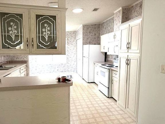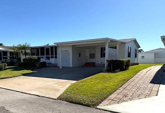 This inviting 2 bedroom, 2 bathroom home offers 1,150 sq ft of comfortable living space, plus a relaxing screened lanai-perfect for morning coffee or evening breezes. The large eat-in kitchen provides plenty of room for cooking and gathering, while the double carport and golf cart shed add valuable convenience and storage. While this home needs a little TLC, it's priced accordingly and offers fantastic potential for someone ready to make it their own. Located in a well-maintained 55+ community, you'll enjoy a friendly atmosphere and an easy Florida lifestyle. Don't miss this great opportunity!