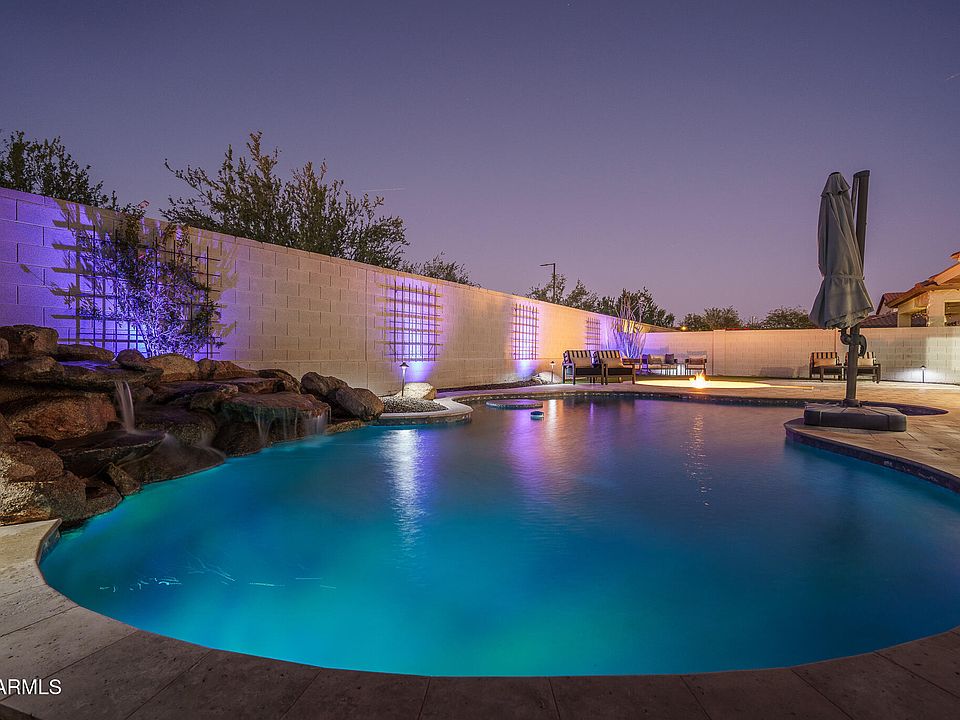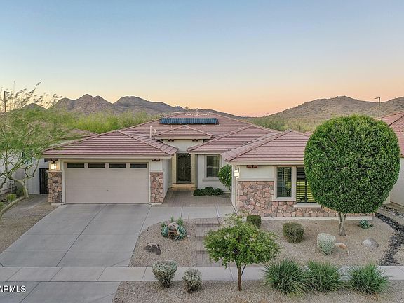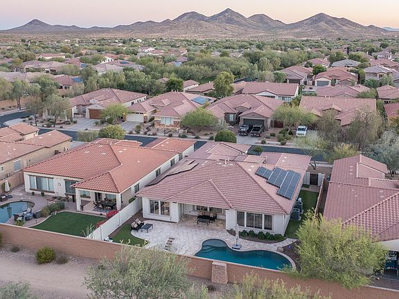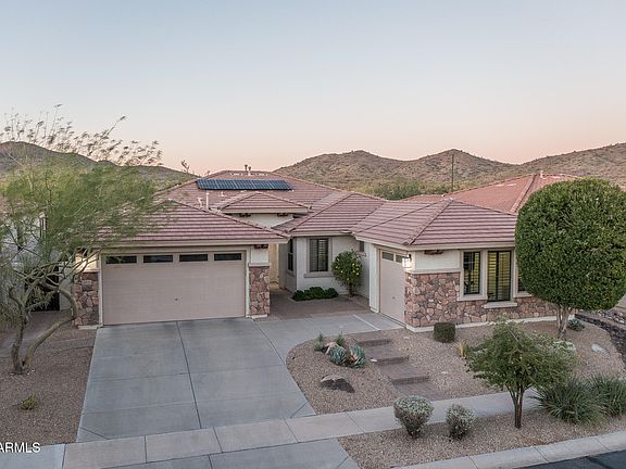 Welcome to this stunning home offering curb appeal, a 3-car garage, and breathtaking mountain views. Enjoy North-South facing for optimal sunlight, 42 owned solar panels for energy efficiency and a resort style backyard! Inside, you'll find numerous upgrades including Lutron automated shades in the living areas and shutters in the bedrooms. The thoughtfully designed floorplan includes 5 bedrooms, a den, and a spacious great room with surround sound. The gourmet kitchen boasts stainless steel appliances, a waterfall island, quartz countertops, and a walk-in pantry. The primary suite offers a luxurious ensuite with a soaking tub, separate shower, dual sinks, dual walk-in closets, and backyard access. Step outside to a cozy covered patio, surrounded by beautiful travertine pavers that extend out to a sunken firepit and a pebble tech pool complete with a serene waterfall, perfect for entertaining or relaxing in your desert oasis. Additional features include R/O, Water Softener, laundry room with cabinets and a sink, tankless water heater, a mini-split HVAC in single garage, and 2 year old AC units! Do not miss out on this beautiful home!Welcome to Sonoran Hills, a gated community offering exceptional amenities including a refreshing community pool, sports courts, and a dog park, perfect for active lifestyles. Conveniently located near major freeways, residents enjoy easy access to dining, shopping, and entertainment. With its blend of resort-style living and ideal location, Sonoran Hills provides the perfect balance of comfort and convenience.