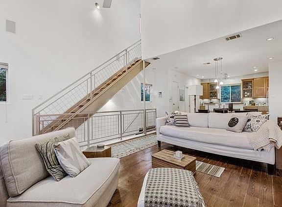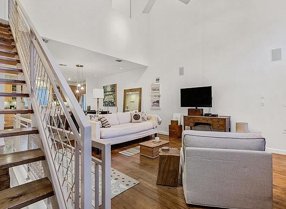 Stunning Clarksville Condo in 4 Unit Community. Contemporary design with open floor plan, soaring ceilings and abundant natural light. Living area with fireplace surrounded by windows and a balcony overlooking the private backyard. Large kitchen with great counter and cabinet space. Reclaimed hardwood floors on living level. Great separation with one bedroom/ensuite bath on main level and master suite on top level. 2 car garage. Several Cafes and shopping just down the street.