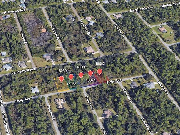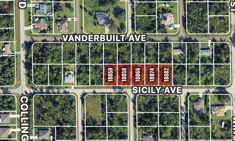 5 (FIVE) contiguous LOTS available. Great opportunity for a home builder to manage and build 5 homes in a row. Excellent location of Collingswood Blvd., just south of Edgewater Dr. Short commute to shopping and major access ways. This price ONLY for all lots, owner do not sell separated. 18050 Sicily Avenue, Port Charlotte, FL 33948-8808 PID# 402230151006 18058 Sicily Avenue, Port Charlotte, FL 33948-8808 PID#402230151007 18066 Sicily Avenue, Port Charlotte, FL 33948-8808 PID#402230151008 18074 Sicily Avenue, Port Charlotte, FL 33948-8808 PID #402230151009 18082 Sicily Avenue LLC PID#402230151010