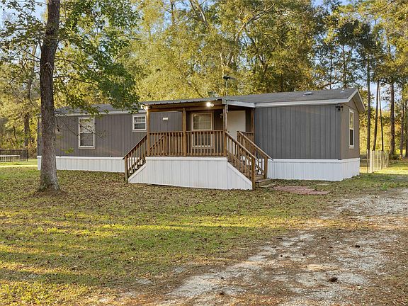 Quiet and peaceful living on 2.29 acres of land. Property is cleared, but many beautiful mature trees still throughout offering a lot of privacy. Home is very well-maintained offering 2 bedrooms and 2 full bathrooms. Gray tone color palette offering chic finishes. Spacious bedrooms, built-in entertainment center in living room, kitchen bar top open to living area, lots of light, and ceiling fans. Custom 10x12 covered front patio. Fenced back yard space. 16x20 building with electric, window A/C, and plumbing connection. Septic system and community well. NO HOA.
