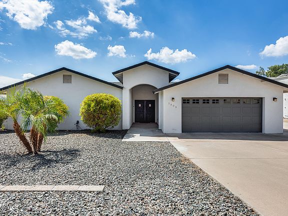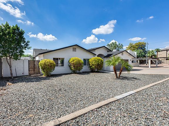 Step into timeless elegance with this fully remodeled 4-bedroom, 2-bath gem, perfectly situated on a sprawling 11,266 sq ft lot with no HOA! Boasting 2,259 sq ft of thoughtfully designed living space, this home offers an open-concept floor plan with tasteful, high-end upgrades throughout. Soaring vaulted ceilings and wood-look tile flooring in all common areas create a seamless blend of style and comfort, while plush carpet adds warmth to each bedroom. The chef's kitchen shines with granite countertops, crisp white cabinetry, a chic subway tile backsplash, and an island with a breakfast bar—perfect for entertaining. The spacious primary suite features a walk-in closet and a spa-inspired ensuite with a beautifully tiled shower. Outside, enjoy the recently updated (2022), south-facing backyard with two covered patios and breathtaking mountain views. With a 2-car garage, extra slab parking, and a prime location near Paradise Valley, top-rated schools, shopping, dining, and easy freeway access - this home truly has it all.
