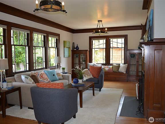 Classic 1917 Craftsman in the heart of Ravenna, blending historic charm with thoughtful updates. Original oak and fir floors, rich crown molding, leaded glass built-ins, and natural fir trim create warmth throughout. Spacious living and dining rooms flow beautifully into the main floor layout. Upstairs offers three large bedrooms and a full bath. Bonus third-floor retreat perfect for office, playroom, or creative space. Fresh paint in and out, refinished floors, new carpet, updated bath, inviting landscaping. Enjoy peaceful mornings on the front porch and sunsets from the private rooftop deck. Fully fenced backyard, sun-drenched garden space, and detached garage complete this special home—just blocks to Ravenna Park, light rail, and cafés.