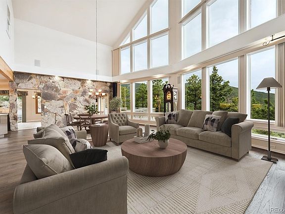 PRICE IMPROVEMENT! MOUNTAIN VIEWS! Enjoy 360-degree views of the Rocky Mountains and the city from this custom mountain home, situated on an idyllic 2.7-acre lot in Saddleback Ridge Estates. A grand foyer opens to a stunning three-story-tall great room with oversized windows that allow for abundant natural light, while also perfectly framing the breathtaking western-facing Rocky Mountain views. The well-appointed chef’s kitchen has been entirely reimagined, featuring luxury appliances, an oversized center island, quartz counters, custom cabinetry, and meticulous attention to detail. Steps off the kitchen, a spacious sunroom is the ideal spot for casual entertaining with a wood-burning fireplace and easy access to the outdoor deck. The multitiered composite deck offers impeccable indoor/outdoor living featuring an outdoor kitchen, hot tub, and fire pit with picturesque views in all directions. Retreat to your primary residence, a true sanctuary with a fireplace, wet bar, sizeable walk-in closet, and an ensuite 5-piece bath. Three generously sized secondary bedrooms offer ensuite bathrooms and ample functional living space. The walk-out basement serves as the ideal canvas for entertainment, featuring a large rec room with a rare, custom wet bar that incorporates the actual rock formation from inside the home. The custom home theatre includes Lutron lighting, built-in speakers, and wood accents. This spacious basement also includes a bedroom with walk-out access to the patio with views and a full bathroom to accommodate guests with ease. Additional features of this custom mountain residence include new carpet, fresh interior paint, a main-floor home office, a 700-bottle wine cellar, an attached 3-car garage with large storage area and 4 fireplaces. Saddleback Ridge Estates is secluded yet easily accessible, offering a peaceful retreat that combines quiet privacy with convenient access to daily amenities. Do not hesitate to experience this custom mountain retreat today!