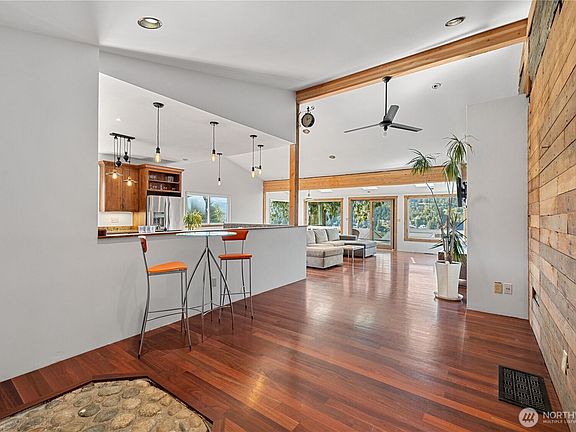 Spacious kitchenKitchen and bath remodelMahogany floorsCustom penny flooringViews of the lakeClaw foot tubDual head shower