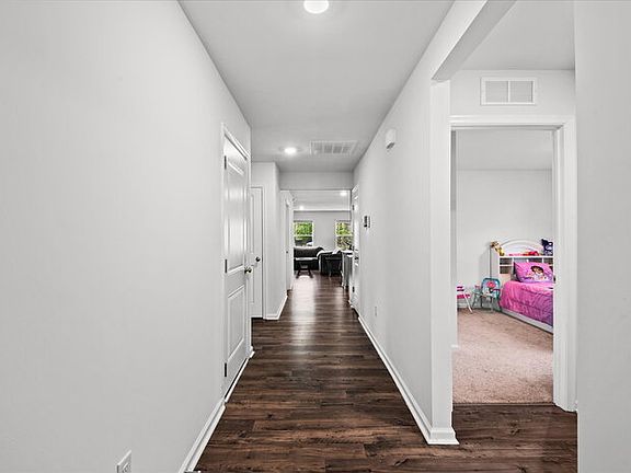 The dining area and living space flow seamlessly together, filled with natural light and peaceful wooded views from the back windows. With over 1,600 sq. ft. of living space, this home offers four bedrooms and two full bathrooms, including a private primary suite with a walk-in closet and dual vanities.