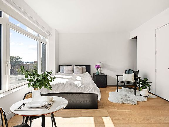 This open studio is filled with natural light, featuring oversized south-facing windows. The spacious layout provides a comfortable sleeping area, dining, and living space.