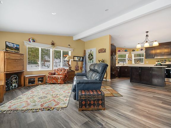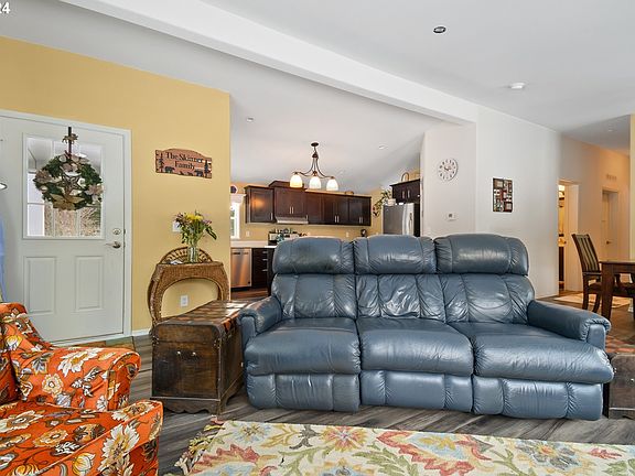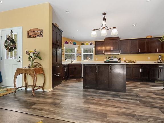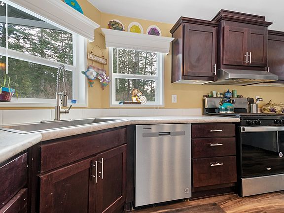 2024-built Skyline Champion Home, nestled on two parcels totaling 1.85 acres on a dead end road offering a myriad of amenities, including a rear patio, front porch, walk-in pantry and propane appliances. A spacious 24x24-foot pole barn complete with built-in shelves and a workbench, a 200-square-foot unfinished in-law suite featuring a loft, an 11x11 shed, a lean-to, and a cozy chicken coop. The surrounding orchard boasts an impressive array of fruit trees, including fig, elderberry, cherry, various apple varieties, and Royal Italian Plums. This haven has fostered a thriving organic compost business and played a vital role in the local Stevenson Farmers Market, providing an abundance of fresh produce for summer income. Complementing this is a 50x50 garden enriched by over 100 yards of organic compost over the past three years, surrounded by majestic noble fir trees and mature rhododendrons. The property's sunny, level terrain includes a fenced dog run spanning over a half an acre, offering ample space for furry companions to roam. Tranquil Kanaka Creek flows along the rear boundary of both properties. Recent upgrades include a new pump, pressurized tank, copper lines, and electrical wiring from the pole to the home and pump house.The home boasts upgraded energy-star insulation and a reinforced roof load, ensuring both efficiency and durability. The kitchen showcases an ample cupboard storage crafted from rich hardwood walnut, complemented by a generously sized farm sink positioned in front of three picturesque windows and hard-top island. Custom farmhouse chandeliers adorn the kitchen and dining room, creating an inviting ambiance. The home is thoughtfully wired and braced in each room for ceiling fans, allowing new owners to personalize their space with a designer lighting.