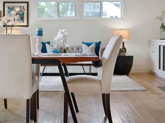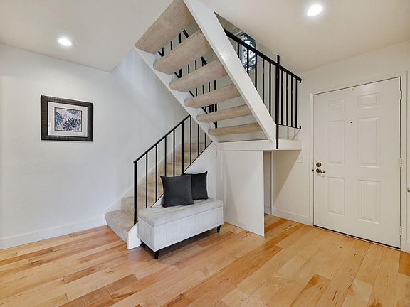 Private virtual and in person showings available. Spectacular contemporary end unit townhome, extensively updated two years ago and walking distance to Castro St. and downtown Mountain View. Modern open concept main level with kitchen opening to dining/living room combo and sliding doors to a slate-tiled private patio. Upgraded fireplace surrounded by built-in custom cabinetry, powder room and full laundry downstairs. Upstairs is complete with a East-facing large master suite with morning sun and vaulted ceilings, three closets and remodeled bathroom. Two additional bedrooms and another remodeled bathroom. Attic has approximately 300 sqft additional storage space (buyer to verify). One deeded parking space with additional ample off-street parking.