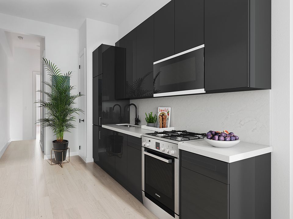 Full-size bosch appliancesSunlit bedroomsSpa-inspired bathroomsClean designRefined finishesQuartz countertopsSleek black-and-white kitchen