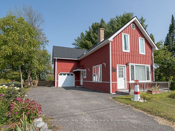 This storybook 1.5-storey, 3-bedroom home combines Muskoka charm with the ease of in-town living. The red-stained wood exterior and lush gardens set the tone, welcoming you into a space filled with warmth and character. Inside, the flexible floor plan offers options for a couple, growing family, or a comfortable home office. The true highlight is the three-season screened Muskoka room with a wood-burning fireplace, the perfect place to unwind on crisp evenings while enjoying the scent of the gardens and fresh Muskoka air. The attached single-car garage provides storage or workshop space for hobbies and projects. Tucked away, yet only minutes to downtown shops, schools, parks, and the Muskoka River, this home offers the best of both worlds: small-town charm, outdoor living, and everyday convenience.
