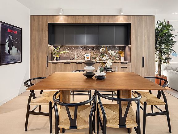 The home begins with a welcoming foyer and then flows into an open-concept living room, dining room, and kitchen saturated with natural light. The kitchen is equipped with a sleek Italian Marmi Scala terrazzo countertop, chic Newform fixtures, custom Alta Cucine cabinets, a Falmec Virgola recirculating hood, and a suite of high-end Bertazzoni and Blomberg appliances. Off the living room overlooking the courtyard the home enjoys a private balcony.