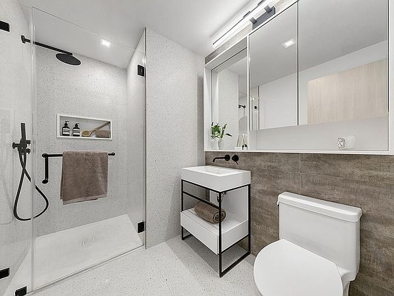 The full bathroom features terrazzo walls, Newform fixtures, custom iStone cabinetry, an integrated sink, and a walk-in Newform rain shower.