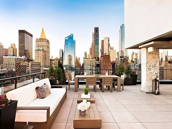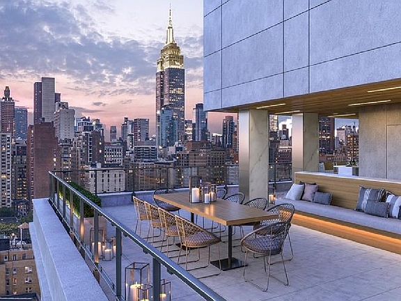 A luxurious common roof terrace with an onyx bar, grill, and elegant landscaping showcases a stunning 360-degree view of Manhattan, 24/7 doorman & concierge services, a duplex fitness space that offers dedicated cardio and weight rooms with light wood flooring and natural light, and a dedicated and naturally-lit resident lounge spotlights a Scavolini kitchen, wet-bar, and serene recessed fireplace with a comfortable seating area bathed in southern exposure.