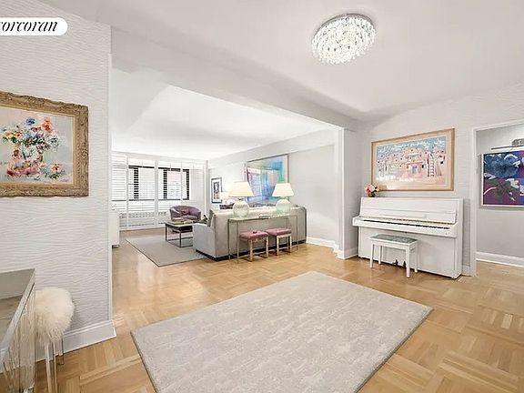 Impeccably renovated south-facing corner 2BR/2BA on beautiful tree-lined block on Manhattan's Upper East Side. With 1400 square feet and a combined living room and entrance gallery which is 30 feet long, the apartment feels quite spacious. The 2 bedrooms and 2 baths are located on a separate hallway with an ensuite bath in the primary bedroom and the other outside the second bedroom and available for guest use. The primary bath has a walk-in shower, and the secondary bath has a tub/shower combination. Both bedrooms have excellent closet space. Adjacent to the living room is a separate dining area and a top-of-the-line windowed kitchen which includes a generous pantry. The living room and 2nd bedroom have attractive high quality custom plantation shutters on the windows. There is a convenient coat closet in the entry and a large storage closet in the entrance gallery which some people have converted to a home office. Thru-wall air conditioning.