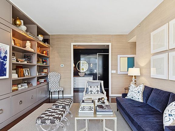 The apartment's outstanding design details include wide plank hardwood floors and automated shades, California Closets and a washer dryer.