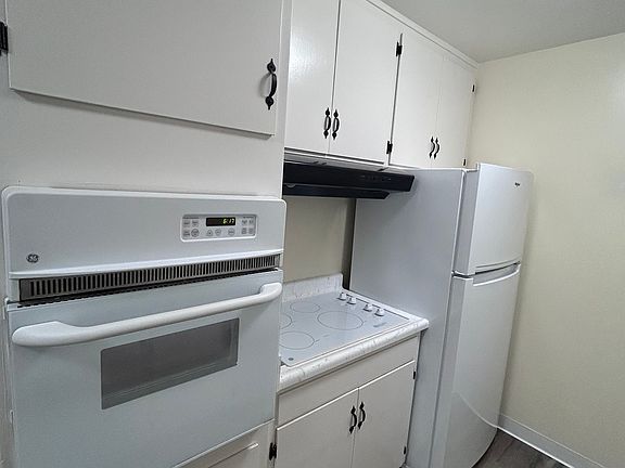 The unit features a great open Floorplan with plenty of space in the kitchen for a table and forced air heat vents throughout. All new clean white appliances including a brand new refrigerator/freezer, and new electric cooktop, wall oven, vent hood and freshly glazed sleek white counters. Cabinets freshly painted as well.