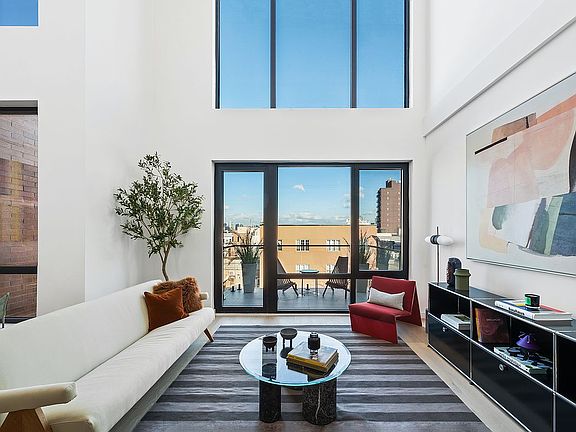 This impressive 1,422 sq ft three-bedroom, two-bathroom duplex boasts breathtaking northern and southern exposures, flooding the space with natural light and offering spectacular views of the Manhattan skyline. The open-concept living and dining areas feature double-height ceilings and a wall of windows that open onto a private balcony—an ideal spot to relax and take in the city’s skyline.