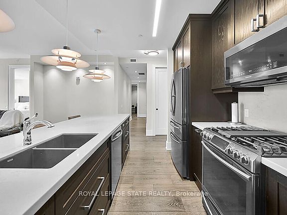 PH4 Luxury Penthouse in the Heart of James North A rare opportunity this 1,391 sq. ft., 2-bedroom plus a den, 2-bath penthouse offers two owned indoor parking spaces and refined upgrades throughout. Perched on the 8th floor with southern exposure, its set in the vibrant James North Arts & Restaurant District, steps from cafés, galleries, shops, Bayfront Park, and the West Harbour GO. The custom Barzotti kitchen boasts upgraded appliances, oversized quartz countertops, a waterfall island, and designer pendant lighting, flowing into a bright living area with south-facing windows. An indoor/outdoor double-sided fireplace opens to a covered balcony perfect for year-round entertaining. Luxury touches are everywhere: soaring 9ceilings, elegant 7 doors, wood flooring, custom motorized window shades, upgraded shower towers, pocket doors, and future-ready wiring. The primary suite features a walk-in closet with built-ins and a 4-piece ensuite with oversized tub and separate shower. The second bedroom also has a walk-in closet and southern exposure, while the versatile den is ideal for a home office. A laundry area with storage, walk-in storage closet, and a new heating/cooling system (2025)add convenience. The building offers secure entry, exercise room, rooftop terrace, and indoor visitor parking. Condo fees include heat, water, and gas you only pay hydro. Easy access to Hwy403. Sophisticated design, prime location, and rare extras this penthouse truly has it all.