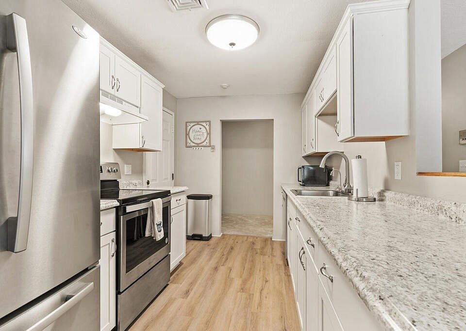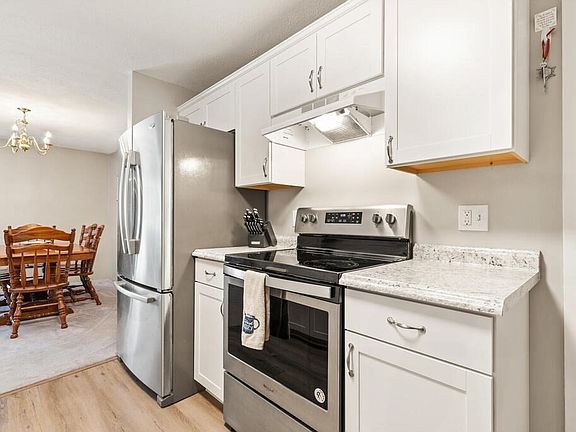 Updated first floor unit in elevator building with one car garage under in desirable complex close to the center of town in Chelmsford. Open concept kitchen, dining and living room with sliders to balcony. Kitchen was fully updated in 2019 with new cabinets, countertops, appliances, flooring, and also has a bar counter for stools if desired. Spacious ensuite main bedroom with fully updated bathroom featuring a tiled shower with glass doors and new tiled floor + vanity. Second bedroom is also a very nice size and common bathroom was updated along with the main one. It has tiled flooring, new vanity and a reglazed bathtub. Space for full size laundry in the unit. You will have one assigned garage space and plenty of guest off-street parking in the front and rear of the building. Storage unit in the garage is also assigned. Easy access to Rt 3, 4, or 495 for communting. Byam elementary and Parker middle schools!
