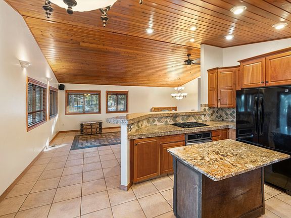 Covered deckGame roomWood ceilingKitchen peninsulaKitchen barLarge kitchen islandStone countertops