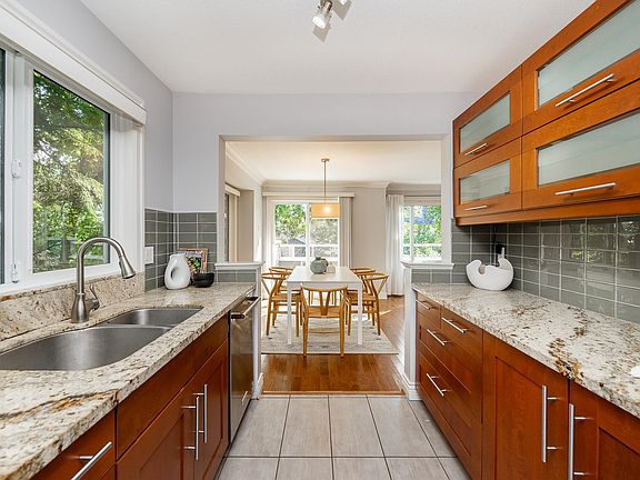 Beautiful END-unit townhome with AIR CONDITIONING! This 2,471 sq ft home offers a spacious, family-friendly layout in a private setting, with 3 beds + 3 renovated baths. The main features a bright kitchen w/granite counters, S/S appliances, gas cooktop and new fridge, seamlessly connected to the family room and eating area w/access to a sunny, South-facing balcony. Formal living and dining area w/gas FP and updated surround opens to a serene patio spanning the width of the home. Upstairs are 3 generous bedrooms, including a primary with walk-in closet + 4-piece ensuite. The lower level offers a large rec room with window, den, ample storage, and double car garage. New windows + balcony, and rough-in for 4th bath. Located in a sought-after catchment, including Heritage Woods Secondary.