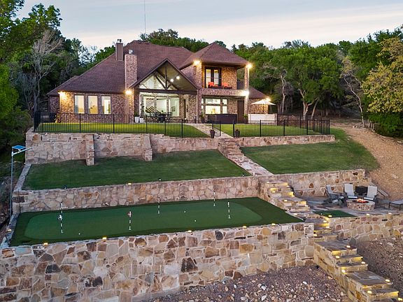 Custom FULLY FURNISHED waterfront home with beautiful views all throughout the property. Open floor plan that includes 4 bedrooms and 3 full bathrooms, plus a bonus room! Built-in safe room for shelter or storage. The outdoor area features a gated area that is great for pets and kids, and a large patio for grilling out while enjoying the gorgeous sunset. A fire pit and turfed putting green are right off your walkway down to the dock. Dock features one boat slip along with two jet ski slips and a floating lounge area. This home is perfect for entertaining your guests lakeside.