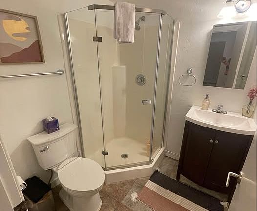 Bath - newly remodeled: shower, toilet, sink, cabinet, and medicine cabinet.