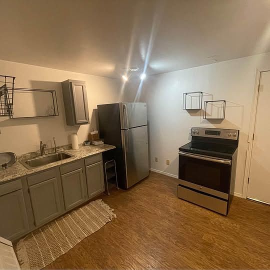 Kitchen - newly remodeled: stainless steel fridge, oven/range, sink, and cabinets with space for a small table.