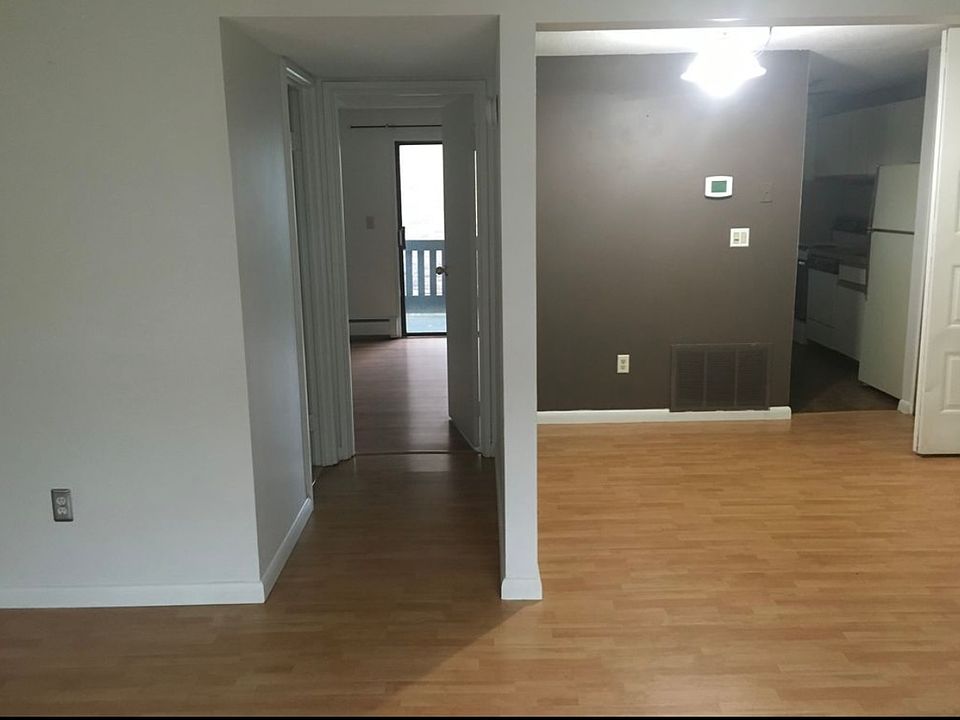 Charming open concept first floor end unit. Condo is currently painted all white, pictures are from previous renter. Private entrance and deck, laminate wood floor. Walking trails, bike path, pond and pool. Shared laundry a few doors down. Convenient to highway, stores and restaurants. Parking directly in front of unit, additional visitors parking on the side of building.