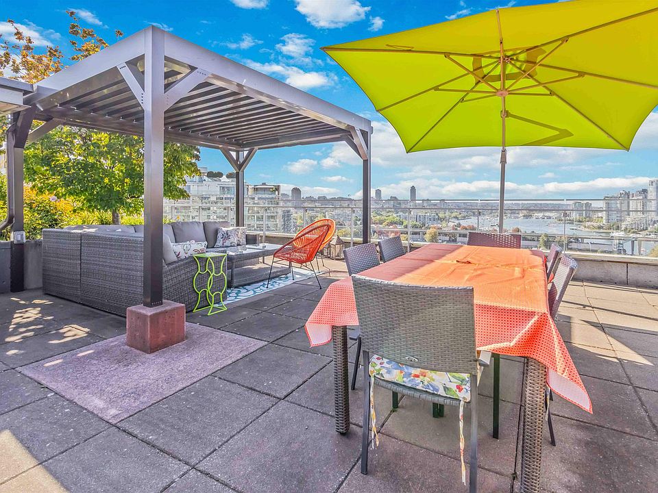 Sophisticated 3 bdrm + den, 2.5 bath VIEW penthouse @ The Brook in Olympic Village w/a massive roof top deck! Designer home w/1,900 sq ft of open-plan living boasts protected, unobstructed views of False Creek, downtown & mtns from every rm + a private rooftop view deck w/ open-air 12x10 pergola, lush greenery, gardens & superb relaxing area. Entertainment-sized principal rooms, gourmet kitchen w/Sub-Zero fridge, wine fridge + walk-in pantry, Murphy bed, radiant heating & cooling, 2 pkg stalls + oversized storage lkr. LEED Gold certified bldg w/concierge, gym + exclusive Gold Medal Club access w/additional gym + pool is in a prime location in Olympic Village near seawall, parks, Canada Line, Aqua bus, Science World, dining, breweries & shops in this vibrant ever expanding community.