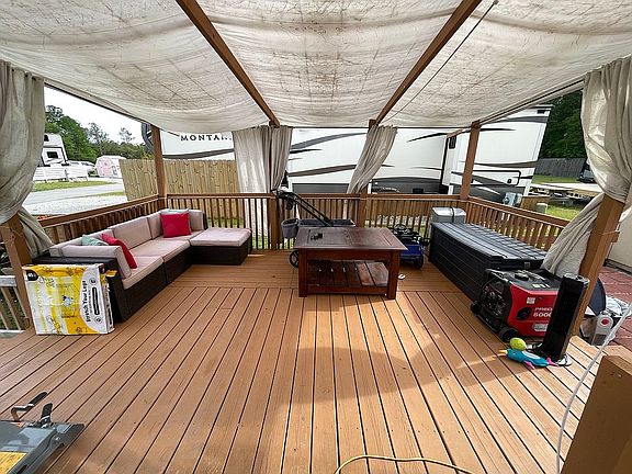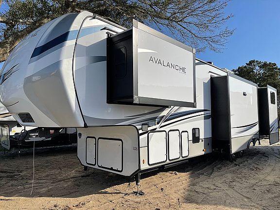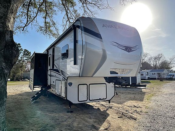 This RV is located in Deep Creek RV resort in Hubert. It is a 2022 keystone Avalanche 378BH with 4 slid outs great for small families. It has 2 AC units and solar that will run lights and fridge. Auto leveling and manuals, one king size bedroom with bath room, a bunk house with 4 beds with a half bath. The kitchen has residential refrigerator and microwave with a 3 burner stovetop and oven. Full size pantry and plenty of cabinets. There is an outdoor kitchen with a tv, sink and mini fridge. Lots of outdoor storage. The price includes the outside deck and shed that comes fully equipped with residential washer + dryer (Samsung) electrical and water is already ran to the shed. New owners will need to comply with the park rules. The spot is a yearly site next to a boat launch. Message me for more information and more pictures.