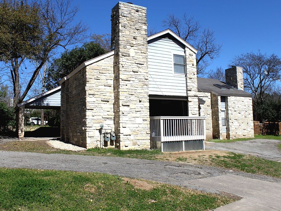 This 2 bedroom 2 bath duplex features a vaulted ceiling in the living room with a fireplace, stained concrete flooring throughout downstairs with an updated kitchen that features black quartz countertops open to the dinning area which has a sliding glass door that allows ample natural light into the living area. There is one bedroom and one full bathroom downstairs, the primary bedroom and bathroom is upstairs.