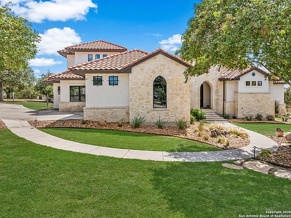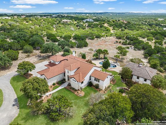 Perched atop a scenic hill, this newly remodeled transitional-style home offers wide open hilltop views, privacy, a gorgeous pool and a detached casita. Stucco and stone with all new windows and doors to frame the hills and invite in natural light. The detached casita sits adjacent to the main home, offering privacy for guests, in-laws, or use as a studio or office. It echoes the same transitional design elements for seamless cohesion. Inside, the home showcases wide-plank white oak wood floors throughout, offering a warm, neutral foundation that complements both contemporary and traditional elements. The color palette leans toward soft whites, warm greys, and subtle earth tones, creating a tranquil and airy feel. Open-concept design connects the kitchen, dining, and living areas, enhanced by recessed lighting, statement light fixtures, and views from every angle. The main home boasts 4 bedrooms and 3.5 baths as well as a separate office with built in custom cabinets, game room, and separate dining room all with beautiful design and attention to detail. Located in Cordillera Ranch and Boerne ISD schools.