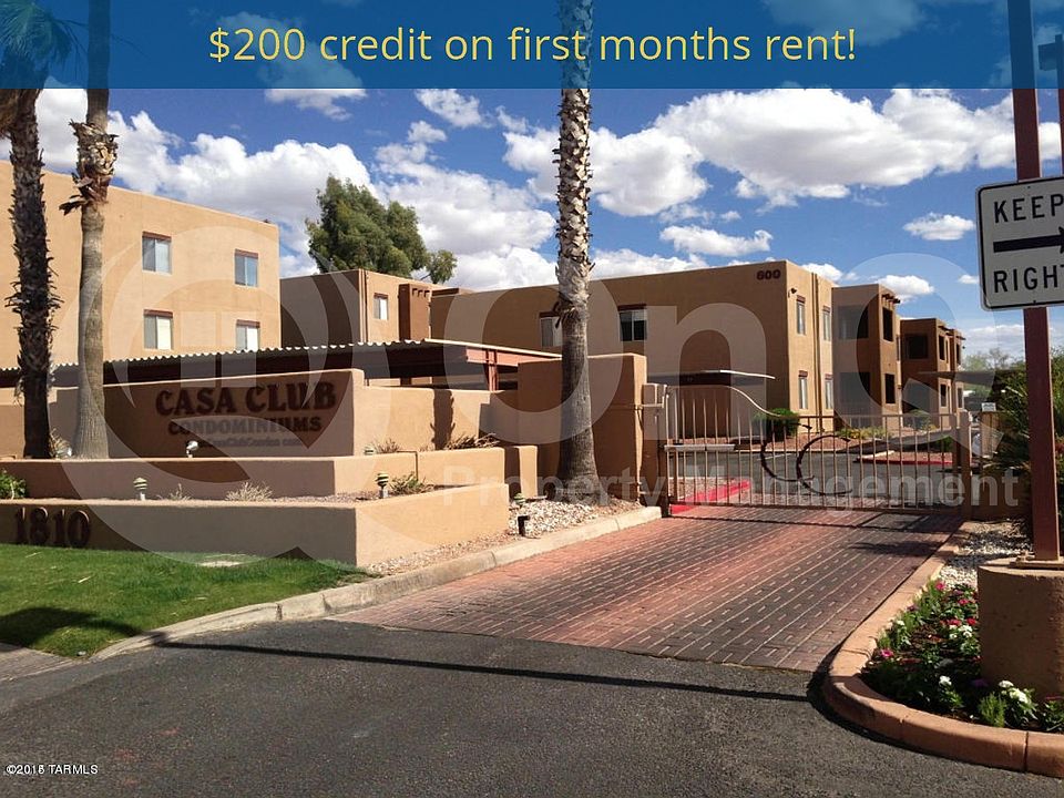 699 SQ FT! 2 bedroom, 2 bath unit in Tucson's Casa Club Condos! Nice & open floor plan. Charming kitchen with included appliances! Open living/dining with sliding door balcony access. Neutral interior with tile flooring in all the right places! Nicely sized bedrooms, each with ample closet space. 2 full baths! Blinds. Private balcony + assigned parking! Casa Club is a desirable community offering gated entry, community pool + spa, fitness center, sports courts, common grills + picnic tables, & laundry facility. Great location, just minutes from U Of A!