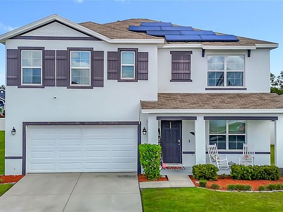 No CDD Fee!! This stunning two-story home, constructed entirely of solid concrete block on both the first and second floors, combines durability with thoughtful design. Built in 2021, the residence offers a spacious, open-concept floor plan that flows seamlessly throughout. Upon entering, you are welcomed into a light-filled main living area where the kitchen overlooks the dining and living spaces, creating an inviting atmosphere perfect for gatherings and everyday living. Extended tile flooring enhances the first floor, adding both beauty and functionality. The kitchen is the heart of the home and comes fully equipped with a stainless-steel appliance package, including a refrigerator, electric range, microwave, and built-in dishwasher. Granite countertops and ample cabinetry provide style and storage, while the open layout makes entertaining effortless. Adjacent to the main living space, a versatile flex room can be used as a home office, playroom, or hobby space, offering endless possibilities to suit your lifestyle. The first floor also includes a comfortable bedroom and a full bathroom, ideal for guests or multi-generational living, as well as direct access to the outdoor patio. Upstairs, the expansive Primary Bedroom serves as a private retreat with plenty of room for a sitting area or additional furnishings. Three generously sized secondary bedrooms surround a large second living area, creating a loft-like space perfect for relaxation, gaming, or family movie nights. A third full bathroom is conveniently located to serve the additional bedrooms. The laundry room, complete with a washer and dryer, is also situated on the second floor for added convenience. The backyard is a true highlight of this property. In 2023, a custom-designed pool, pool cage, and paver deck were installed by Southern Pools, transforming the outdoor space into a resort-style retreat. Whether you prefer to spend your time swimming, sunbathing, or hosting friends and family, the pool area is designed for both relaxation and entertainment. The fully fenced yard ensures privacy, while the durable pool pavers add elegance and easy maintenance. Energy efficiency is another standout feature of this home. The owned solar panels (not leased) provide long-term savings on utility costs while reducing your carbon footprint. This, combined with the quality block construction, ensures a home that is as efficient as it is beautiful. With its modern upgrades, versatile living spaces, and a backyard built for year-round enjoyment, this home offers the perfect blend of comfort, style, and functionality. It is move-in ready and ideal for anyone looking to enjoy both indoor and outdoor living to the fullest.