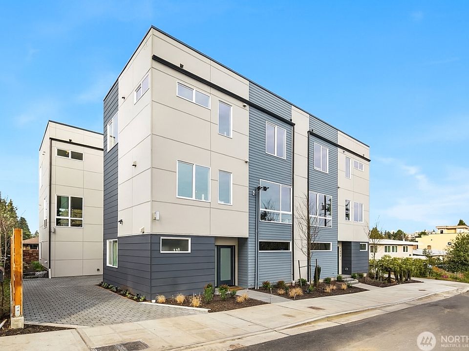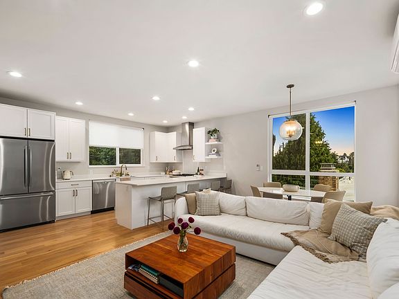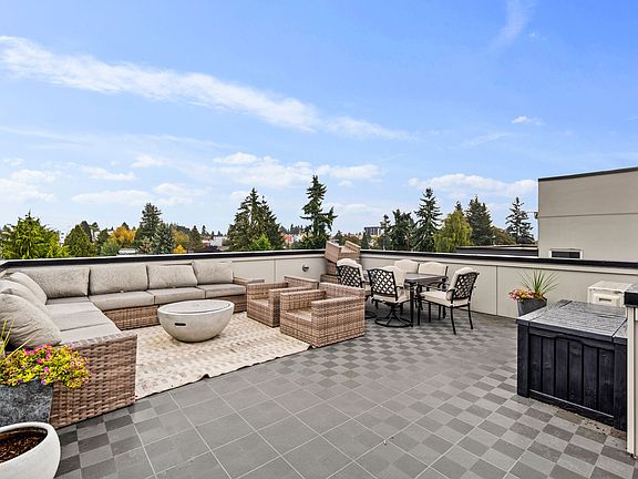 Experience modern living at its finest in this architecturally designed Ballard home featuring stunning views of Puget Sound and the Olympic Mountains. Ideally located where Ballard, Crown Hill, and Olympic Manor converge, this residence combines exceptional craftsmanship with an unbeatable location. Just across from Soundview Playfield and moments from Metropolitan Market, the setting balances quiet residential charm with walkable convenience. Inside, natural light fills the open layout with rich hardwood floors, a sleek fireplace with custom wood mantel, and premium finishes throughout. The chef's kitchen offers Bosch appliances, custom cabinetry, and thoughtful detailing. Upstairs, the primary suite includes a spacious walk-in closet and spa-like bath alongside a second bedroom. The highlight is the 450 sq ft rooftop deck with expansive views, perfect for relaxing or entertaining. An attached garage with EV charger and proximity to Golden Gardens, cafes, and shops complete this remarkable home.
