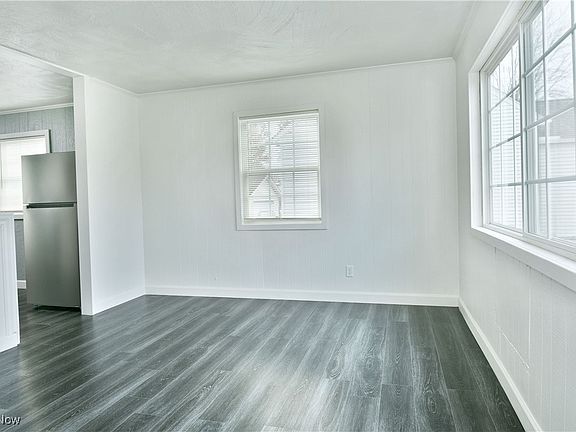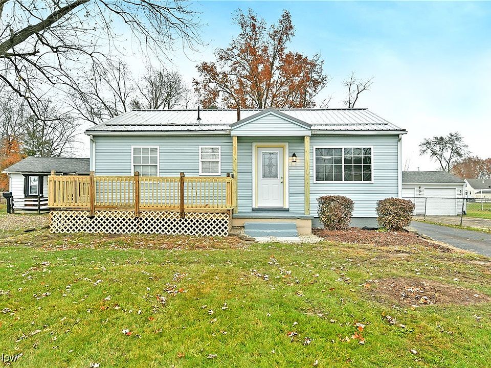 Revel in the bright, inviting charm of this eye-catching Warren ranch! Move-in ready and full of personality, this darling home blends comfort, style, and a desirable three-bedroom layout, all wrapped in a beautiful blue exterior that instantly stands out. Tucked within a well-established neighborhood, the welcoming front deck sets the tone, while the detached two-car garage adds character with its carriage-style windows. Both the home and garage feature durable steel roofing for long-lasting peace of mind. Out back, the nicely sized yard is partially fenced in for convenience and privacy, along with a handy storage shed tucked behind the garage, perfect for lawn tools and outdoor essentials. Inside, sunshine pours into the spacious living room where large lattice windows highlight the warm, wood-style floors. A sculpted pass-through opens into the generous kitchen, featuring elegant tilework, modern finishes, and a cozy dining nook accented by gray, wood-textured walls. Down the main hall, three comfortable bedrooms await, each offering soft carpeting and personal closet space. A charming full bathroom ties it all together with its stylish vanity and clean, updated feel. The partially finished basement extends your living potential with a great rec area, ample storage, and convenient laundry space. A perfect blend of charm, updates, and functionality, this home is ready to welcome its new owner. Updates include: all-new flooring in 2025, a brand-new kitchen with appliances in 2025, interior painting in 2025, a refreshed front deck in 2025, new entry doors in 2025, vinyl replacement windows, and so much more! Plus a one-year home warranty!
