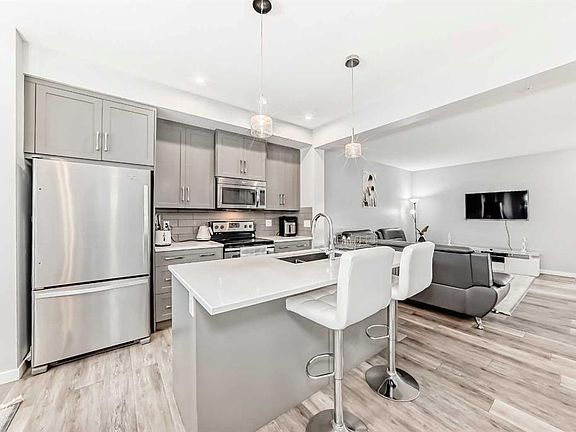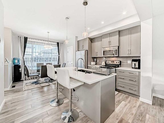 PRESENTING this stunning 2-storey semi-detached full duplex home that shows like brand new. Featuring an oversized single attached garage and a fully finished walkout basement with elegant finishing, this property offers over 2,038 sq. ft. of total developed living space. As you step inside, you’re welcomed by quality vinyl plank flooring that carries through the open-concept main level. This floor includes a spacious front entry, living room, half bath, dining area, and a beautifully designed kitchen that opens onto a large pressure-treated deck with SmartPly support columns and 42" aluminum railing, all overlooking the fully landscaped backyard. The kitchen is a true centerpiece, showcasing a HANSTONE QUARTZ island with an Allan Forest Blanco undermount sink that seats three. Crisp fossil-colored cabinetry—complete with 36" upper cabinets and abundant pot drawers—pairs perfectly with the Feng Shui 3x6 brick-lay backsplash with Brushed Satin Metal Schluter. Stainless steel appliances, undermount lighting, and a separate pantry complete this chef-ready space. Upstairs, you’ll find a large primary bedroom with a walk-in closet and a private ensuite featuring an oversized double shower with Euro tile. This level also includes upper-level laundry, two additional bedrooms, a linen closet, and another full bathroom with Euro tile and a generously sized vanity. Custom blinds are installed throughout the home. The fully finished walkout basement is ready for weekend entertaining, offering a family/rec room, a large utility room with a high-efficiency furnace, a storage area, and a well-sized 4-piece bathroom (with rough-in plumbing). Step directly into the fully landscaped backyard, complete with a shed and patio. Just steps from the canals and walking paths, this home has been exceptionally maintained inside and out. Become part of the sought-after Bayside community, with quick access to schools, parks, shopping, commute routes, and more. This home is the perfect starter property for you and your family.